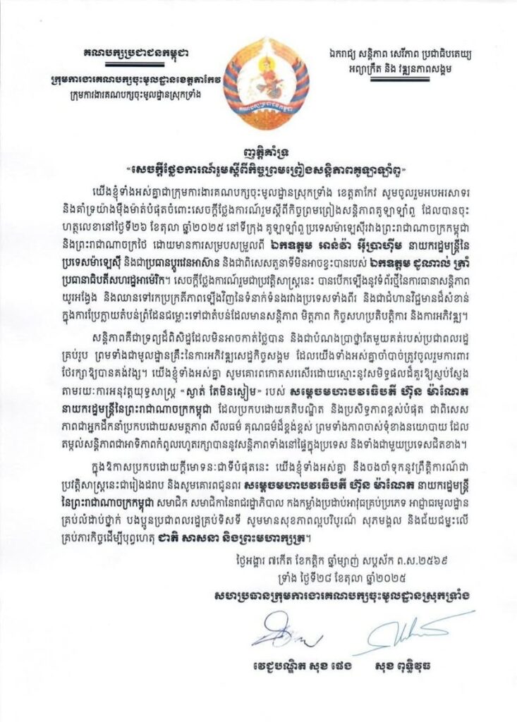 ឯកឧត្តមវេជ្ជបណ្ឌិត សុខ ផេង និង ឯកឧត្តម សុខ ពុទ្ធិវុធ ព្រមទាំងក្រុមការងារគណបក្សចុះមូលដ្ឋានស្រុកទ្រាំង ចូលរួមអបអរសាទរនិងគាំទ្រយ៉ាងម៉ឺងម៉ាត់បំផុតចំពោះសេចក្ដីថ្លែងការណ៍រួមស្ដីពីកិច្ចព្រមព្រៀងសន្តិភាពគូឡាឡាំពួ ដែលបានចុះហត្ថលេខានៅថ្ងៃទី២៦ ខែតុលា ឆ្នាំ២០២៥ នៅទីក្រុងគូឡាឡាំពួ ប្រទេសម៉ាឡេស៊ី រវាងព្រះរាជាណាចក្រកម្ពុជា និងព្រះរាជាណាចក្រថៃ ដោយមានការសម្របសម្រួលពី ឯកឧត្ដម អាន់វ៉ា អ៊ីប្រាហ៊ីម នាយករដ្ឋមន្រ្តីនៃប្រទេសម៉ាឡេស៊ី និងជាប្រធានប្ដូរវេនអាស៊ាន និង ឯកឧត្ដម ដូណាល់ ត្រាំ ប្រធានាធិបតីសហរដ្ឋអាម៉េរិក។